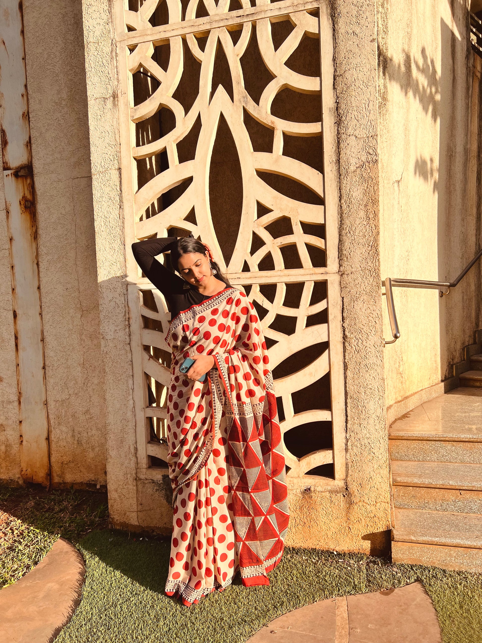 Design: Red polka dots on a creamy base with bold geometric motifs on the pallu